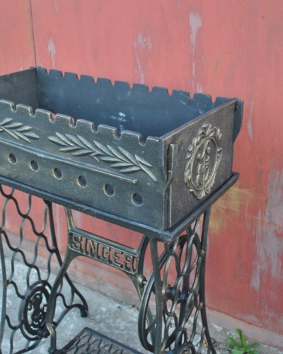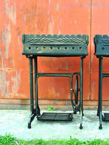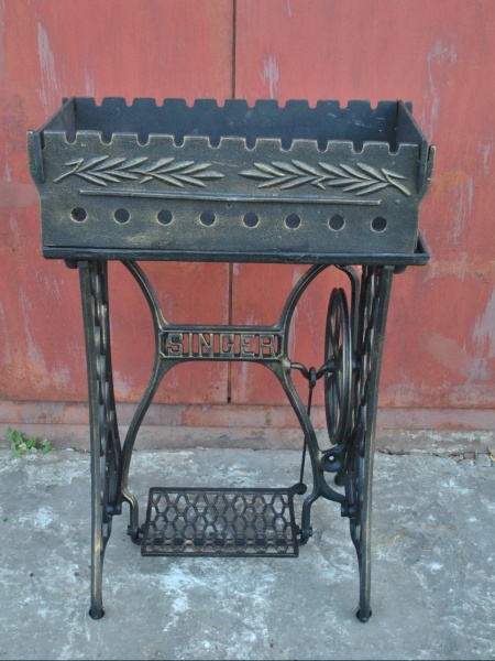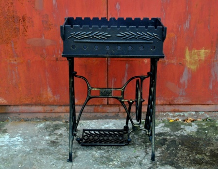 Мангал на станине от советской швейной машинки Подольского завода. Завод являлся наследником завода Singer в России.